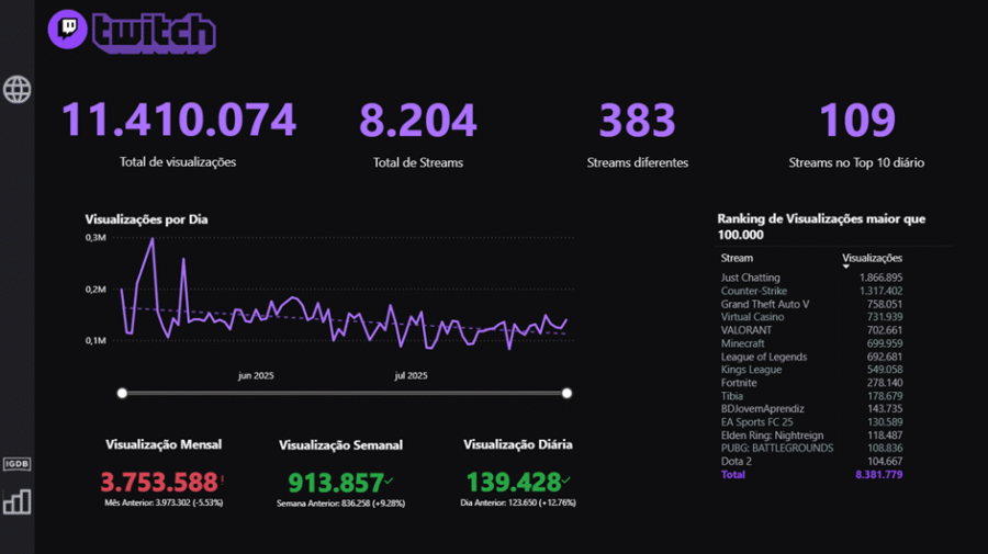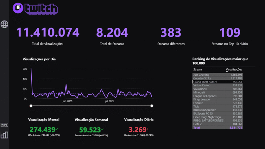 A Tela 1, que possui as informações da Twitch, tem 4 tipos diferentes de informações que serão detalhados abaixo, juntamente com alguns insights importantes. Por último, será apresentado a interatividade do dashboard.