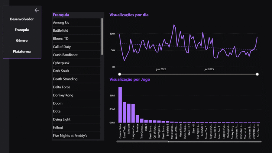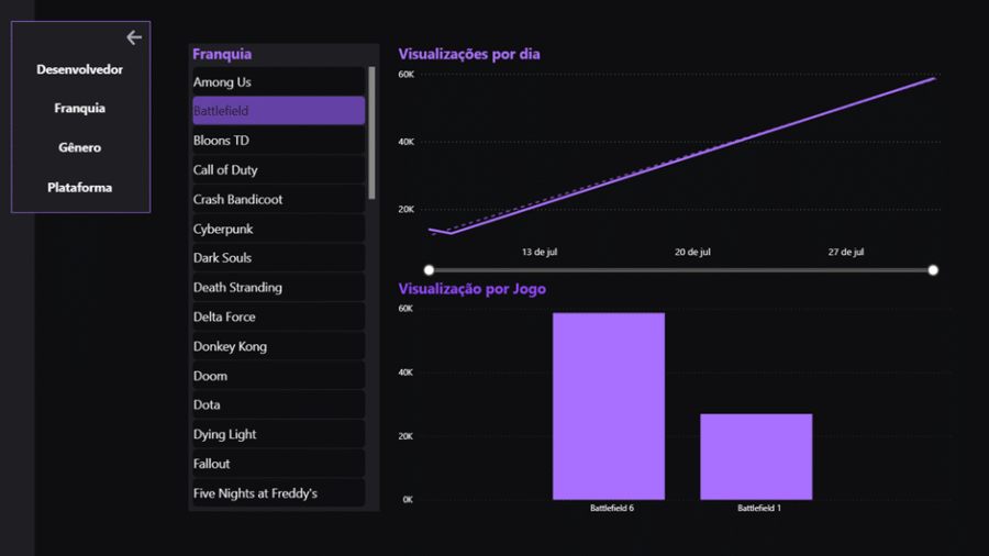 O objetivo dessa tela de detalhes seria possibilitar para o usuário filtrar de uma lista de franquias e verificar os resultados de visualização por dia (somados) e de cada jogo.