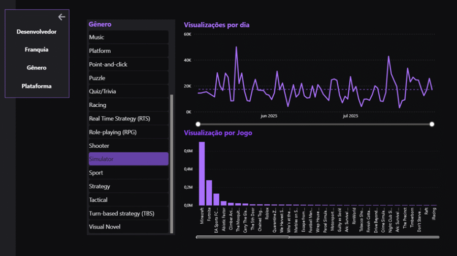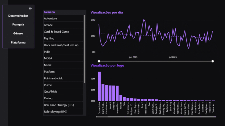 O objetivo dessa tela de detalhes seria possibilitar para o usuário filtrar de uma lista de gêneros e verificar os resultados de visualização por dia (somados) e de cada jogo.