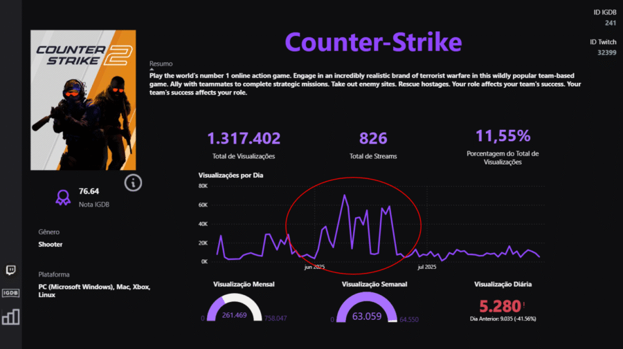 Neste post explico o primeiro estudo de caso obtido pelo Dashboard, referente ao Counter-Strike 2 por ter investigado um pico de visualização.