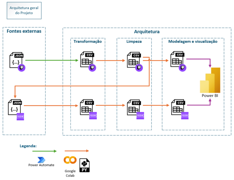 Esses dados da Twitch são transformados para CSV e limpos em Python no Google Colab e os dados do IGDB são coletados via API do IGDB para serem tratados e limpos.