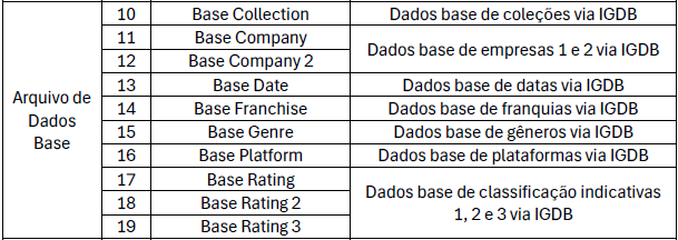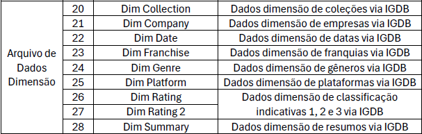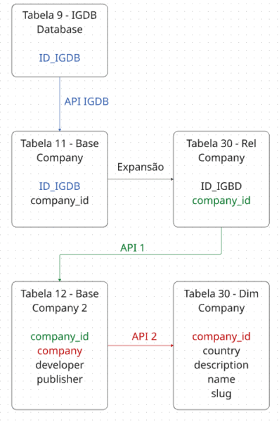 Basicamente, da tabela de ID_IGDB é criada a tabela relação (relação entre a informação e o database), a tabela base (uma base entre relação e dimensão) e por fim, a dimensão (que possui as informações finais).