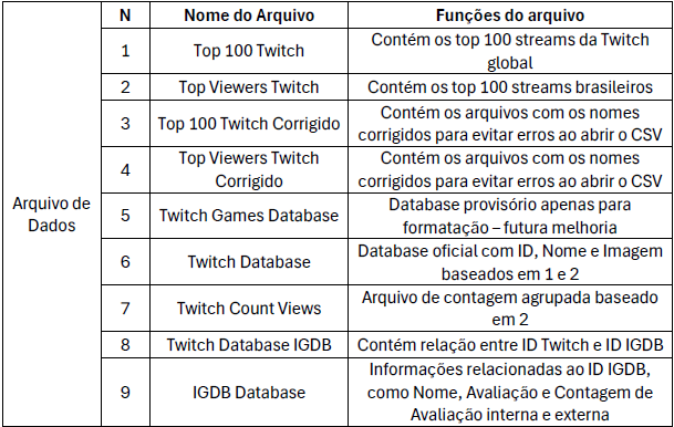 O da Twitch são os mais simples por serem bem objetivos, já possuem duas tabelas por conta da coleta. No entanto, são corrigidas para duas novas tabelas. Essa correção será detalhada no próximo post.