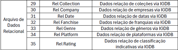 Para as informações IGDB foram criadas as tabelas Base, Dimensão e Relação, pois a complexidade da relação de dados foi um pouco complicada.